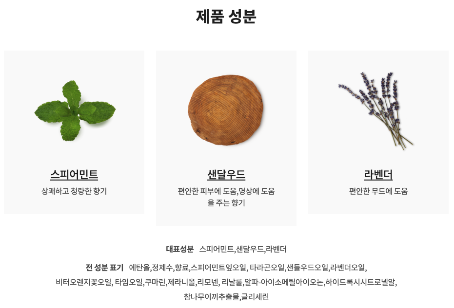 예전에는 러쉬의 트왈라잇을 썼었는데 라벤더가 들어가있었다. 기본적으로 난 라벤더를 좋아하나보다. 스피어민트가 들어있어서 그런지 깨끗한 느낌에 샌달우드 덕분인지 포근하고, 라벤더 덕분에 끝이 달달하다.