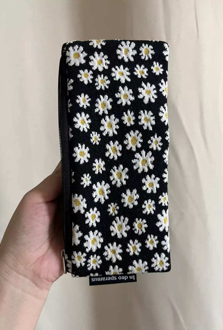 인데오스페라무스(in deo speramus)의 자가드 원단의 꽃무늬 패턴이 매력적인 필통을 구매하게 되었어요.