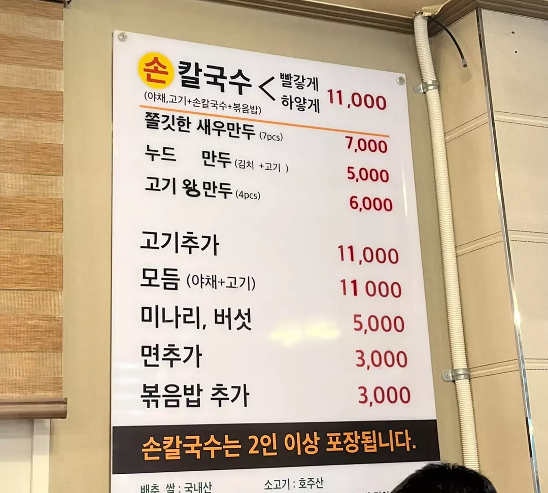 저희는 손칼국수 빨갛게 손칼국수를 주문하고, 쫄깃한 새우만두 + 고기 추가를 했습니다.