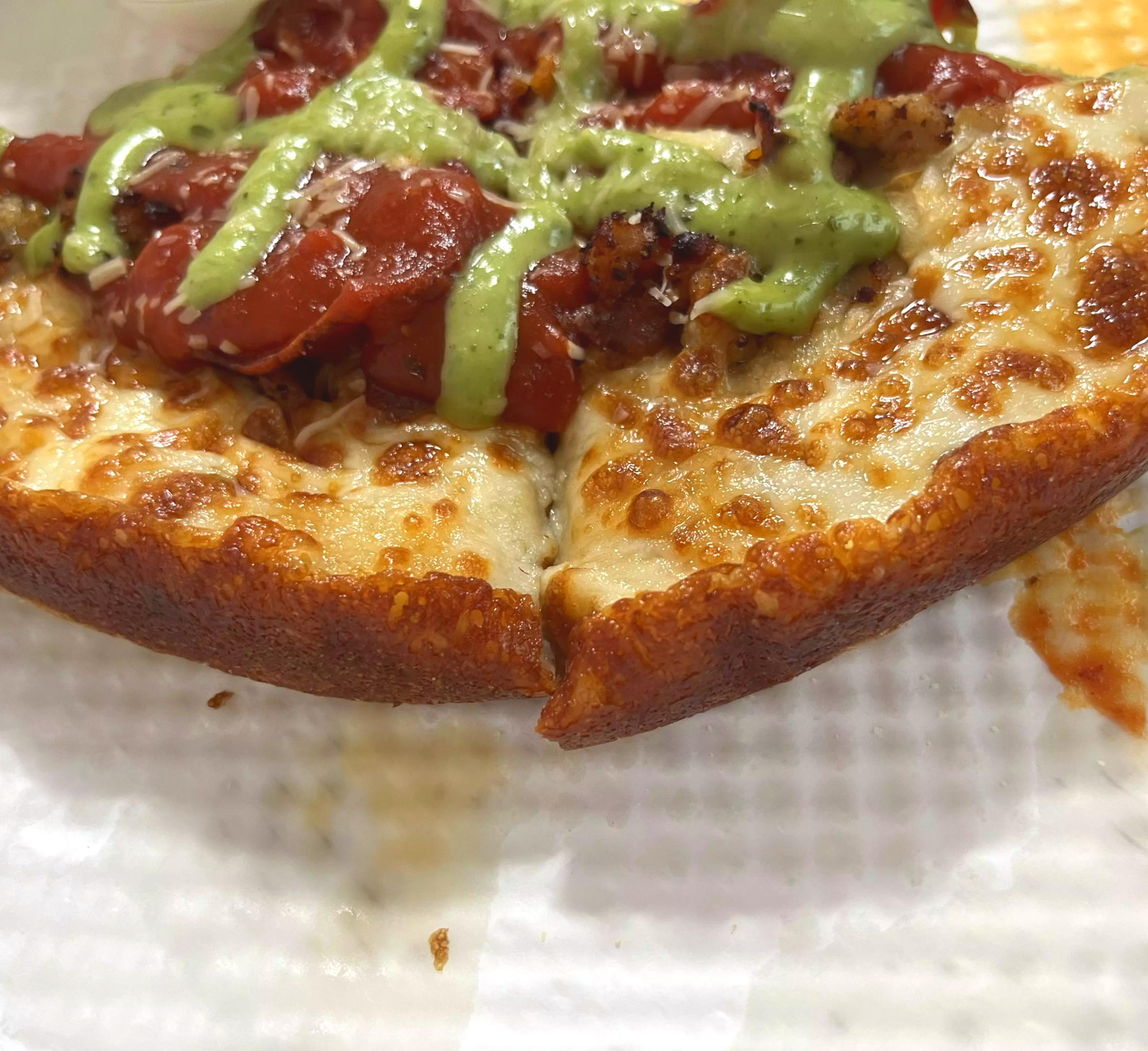 페퍼로니와 바질크림이 체크무늬로 놓여져있고, 사이드의 엣지는 치즈로 노릇하게 감싸져있는 모습을 볼 수 있습니다.