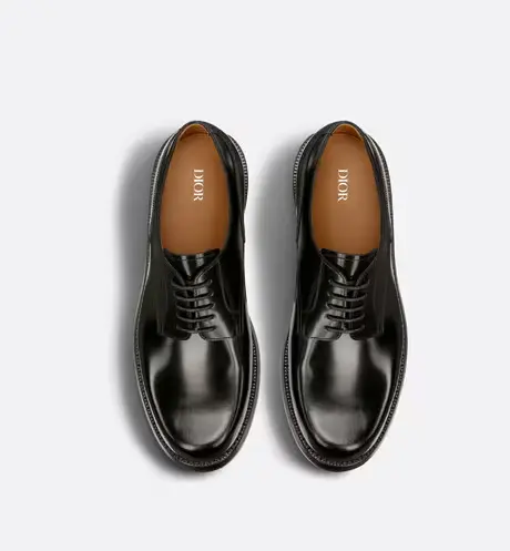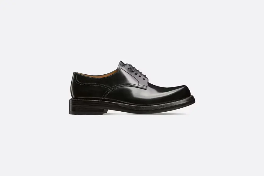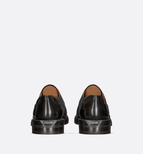 블랙 유광 송아지 가죽 소재로, 블레이크 구조의 가죽 및 러버 솔과 Dior Oblique 미끄럼 방지 인서트가 특징입니다.