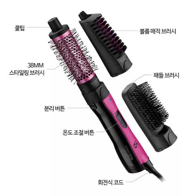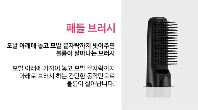 | 장점 | 1. 스타일링이 쉽다. 2. 원하는 스타일링에 맞는 브러쉬를 골라 사용할 수 있다. 3. 열로 인한 모발 손상이 없다. |