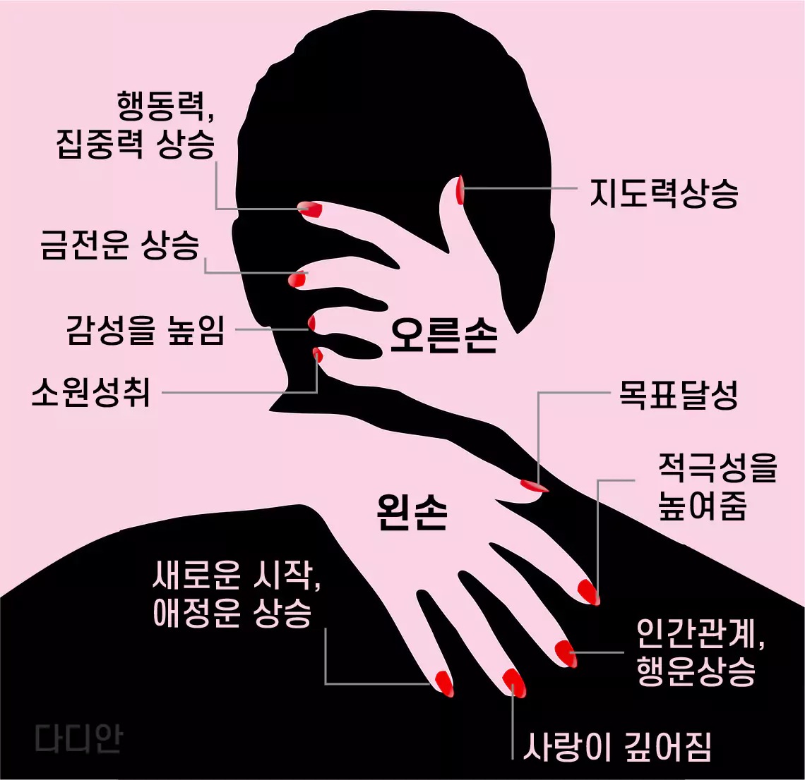 | 엄지 | 지도력 상승을 뜻하며 활동적인 성향, 자신감을 키우고 싶을 때 또는 자신이 현재 솔로라는 표현 |