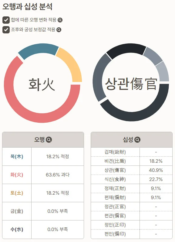 한 오행 성분이 전체 사주의 20%라면 발달, 30%라면 과다라고 봅니다.