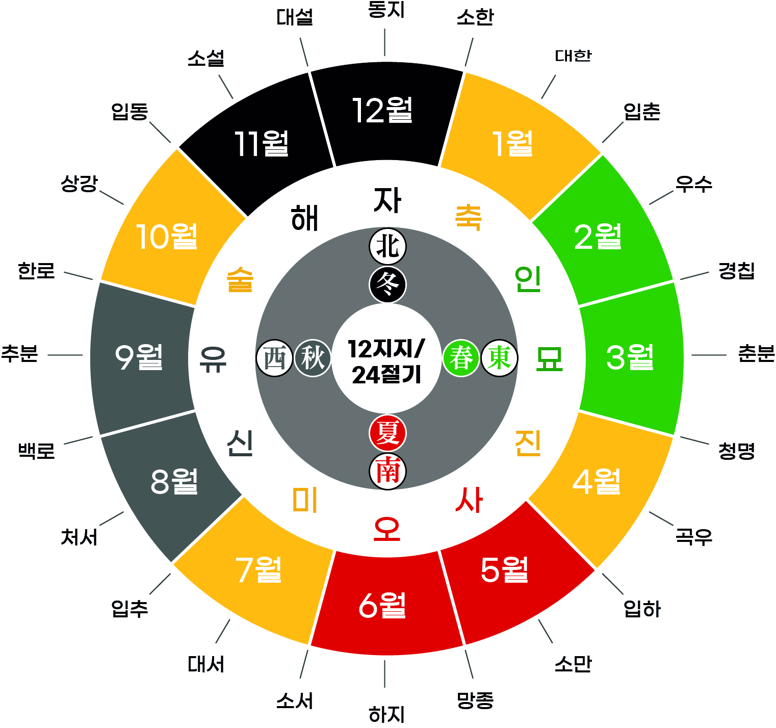 위의 12지지, 24절기를 본인 사주의 속성을 참고하시고, 개운법에 이용해보시는 것도 좋겠습니다.
