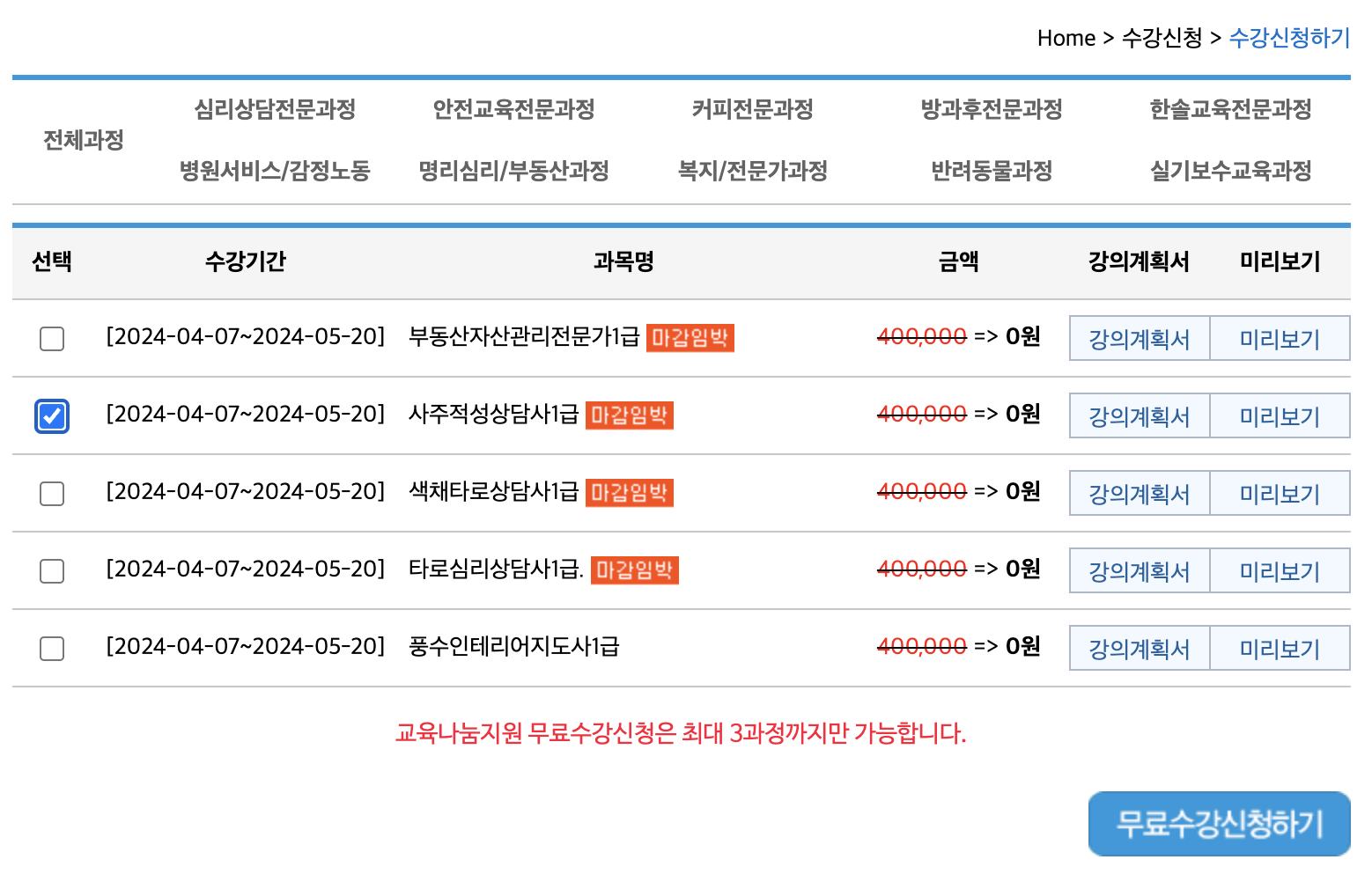 명리심리/부동산 과정에서 '사주적성상담사1급'을 체크 후 '무료수강신청하기'를 클릭해 신청해주세요.