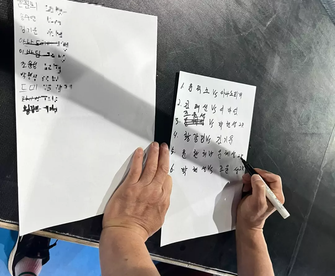 스파링 하실분들이 몸무게를 적어두면 즉석에서 대진표가 짜여집니다.