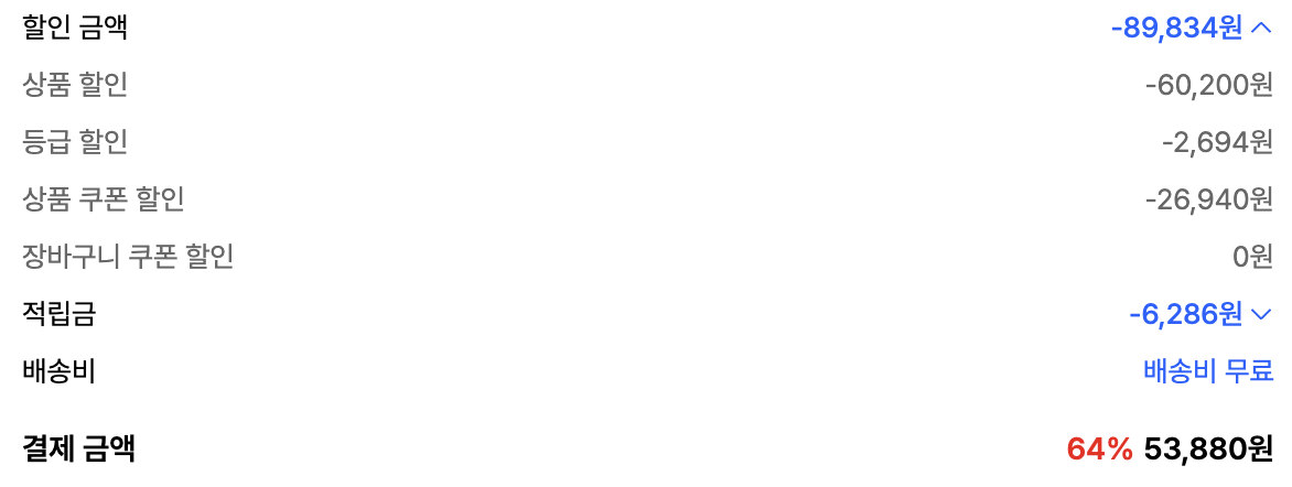 무신사 등급할인, 상품 쿠폰 할인, 적립금 사용으로 총 53,880원으로 구매하였습니다.