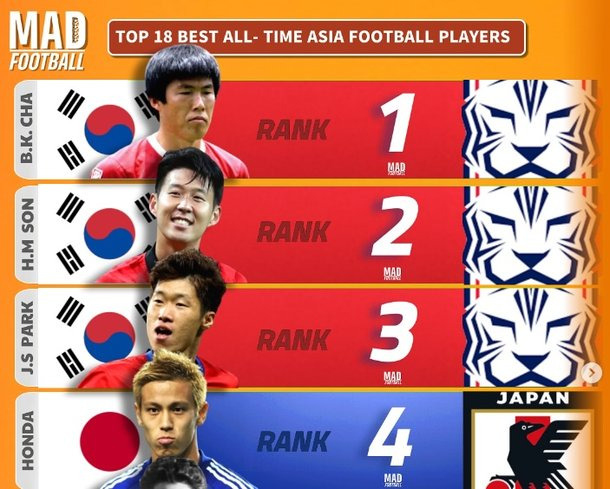 글로벌 축구 매체 '매드 풋볼'이 12일 발표한 "아시아 역대 최고의 축구 선수 18명" 명단에서 대한민국 축구 전설 차범근, 손흥민, 박지성이 당당히 1~3위를 차지하며 아시아 축구의 위상을 드높였습니다.
