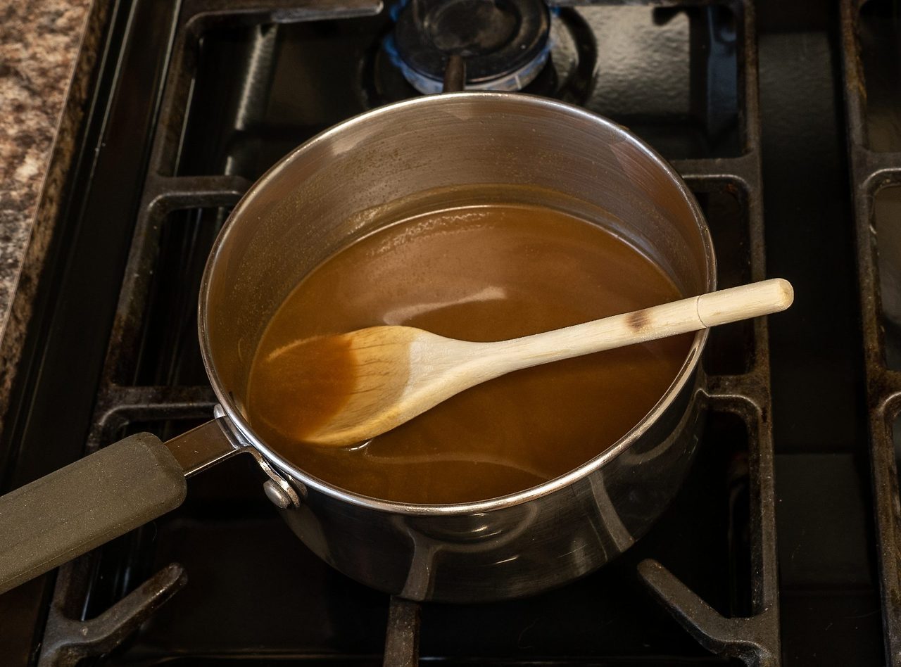 - 버터 + 설탕 + 물엿(또는 꿀)을 끓여 조금 태운 듯한 캐러멜 상태로 졸여 만듭니다.