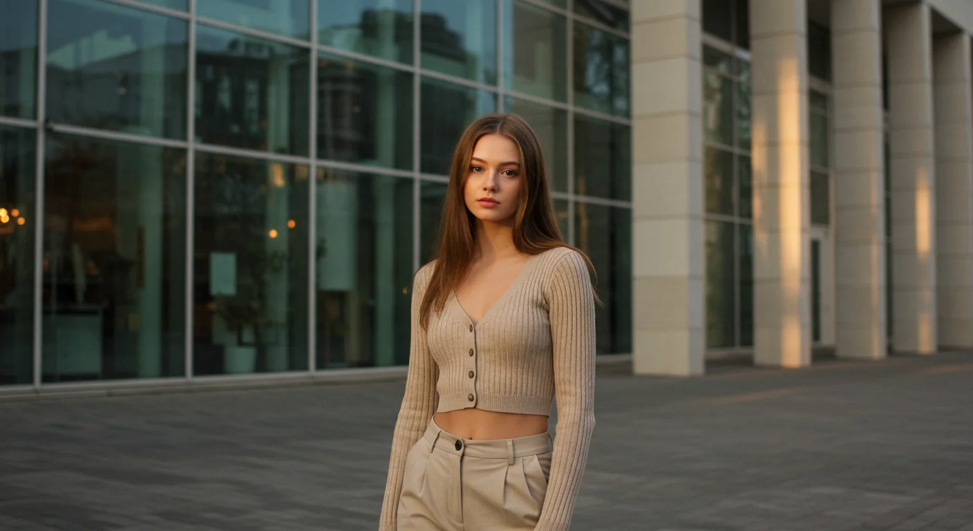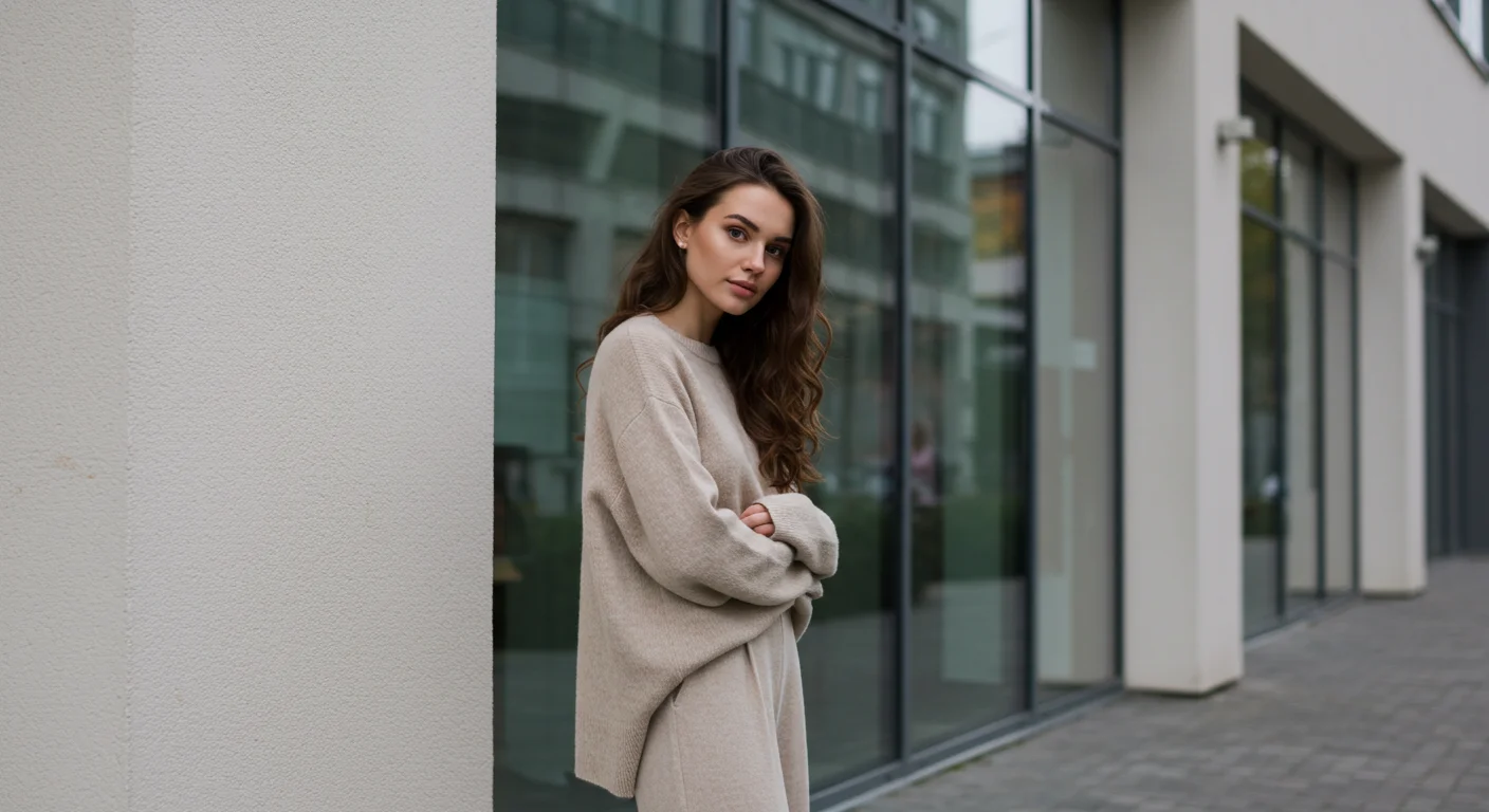 a young woman standing in front of a modern glass building wearing minimalist beige fashion, soft lighting, editorial fashion style, Instagram aesthetic, soft neutral color palette