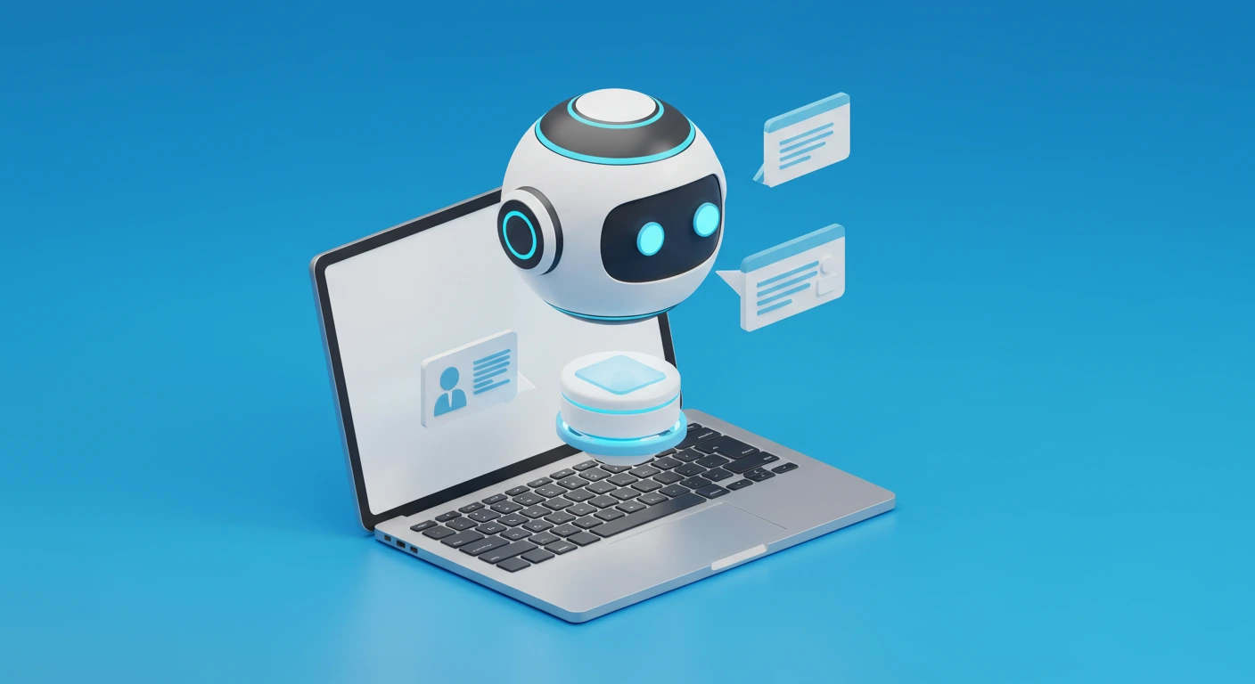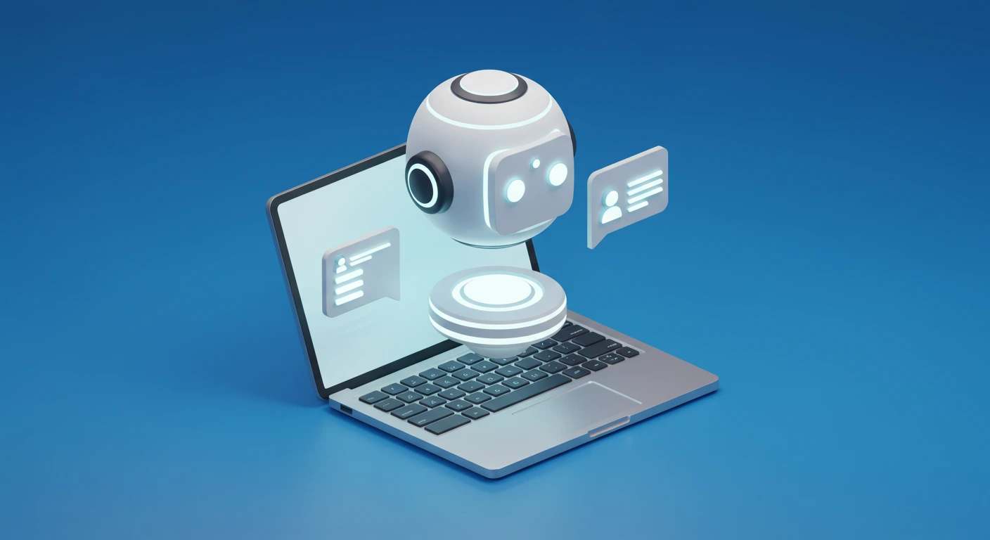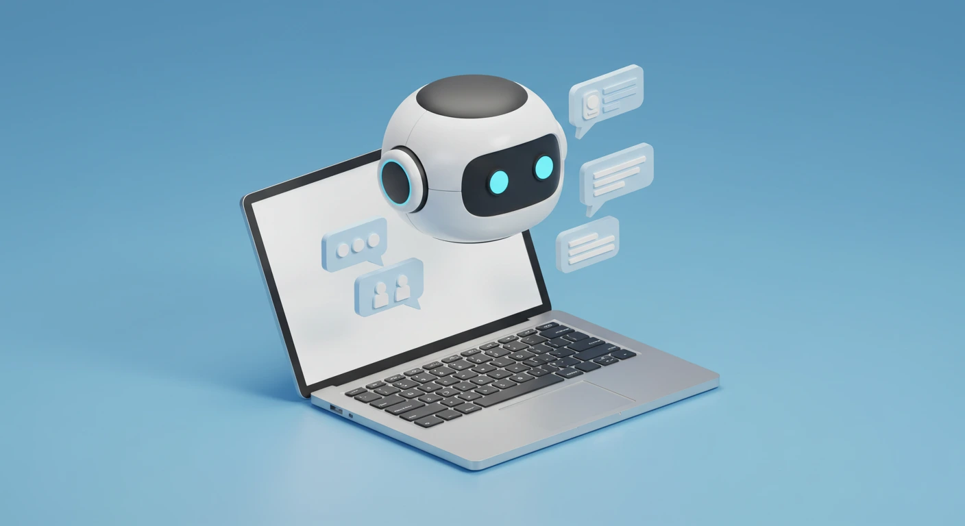 3D illustration of an AI chatbot floating above a laptop, minimal design, blue background, futuristic style, isometric tech concept