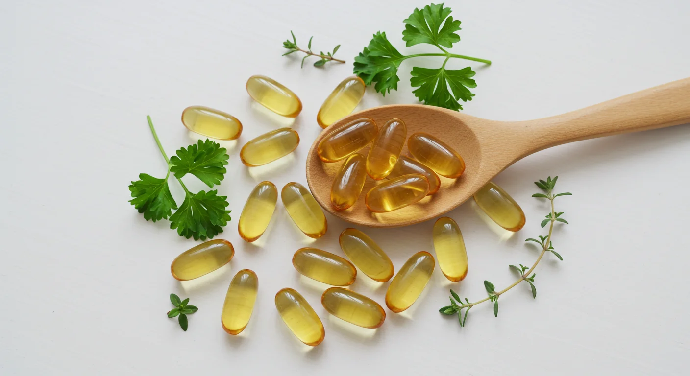 top view of omega-3 capsules, wooden spoon, fresh herbs, white table background, clean and organic product style, professional lighting