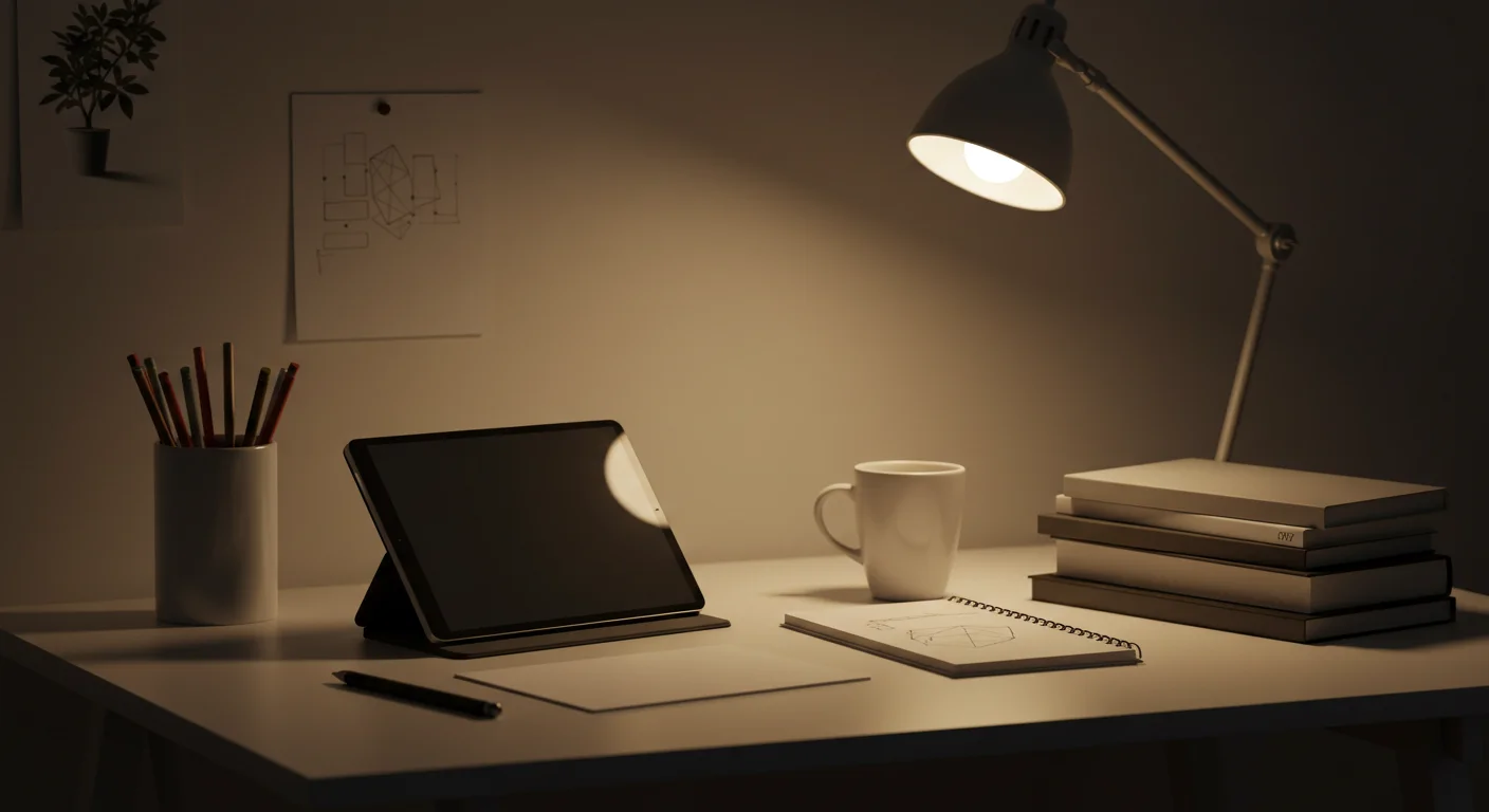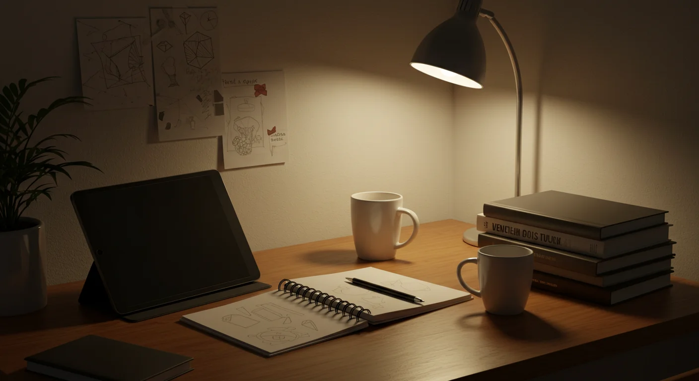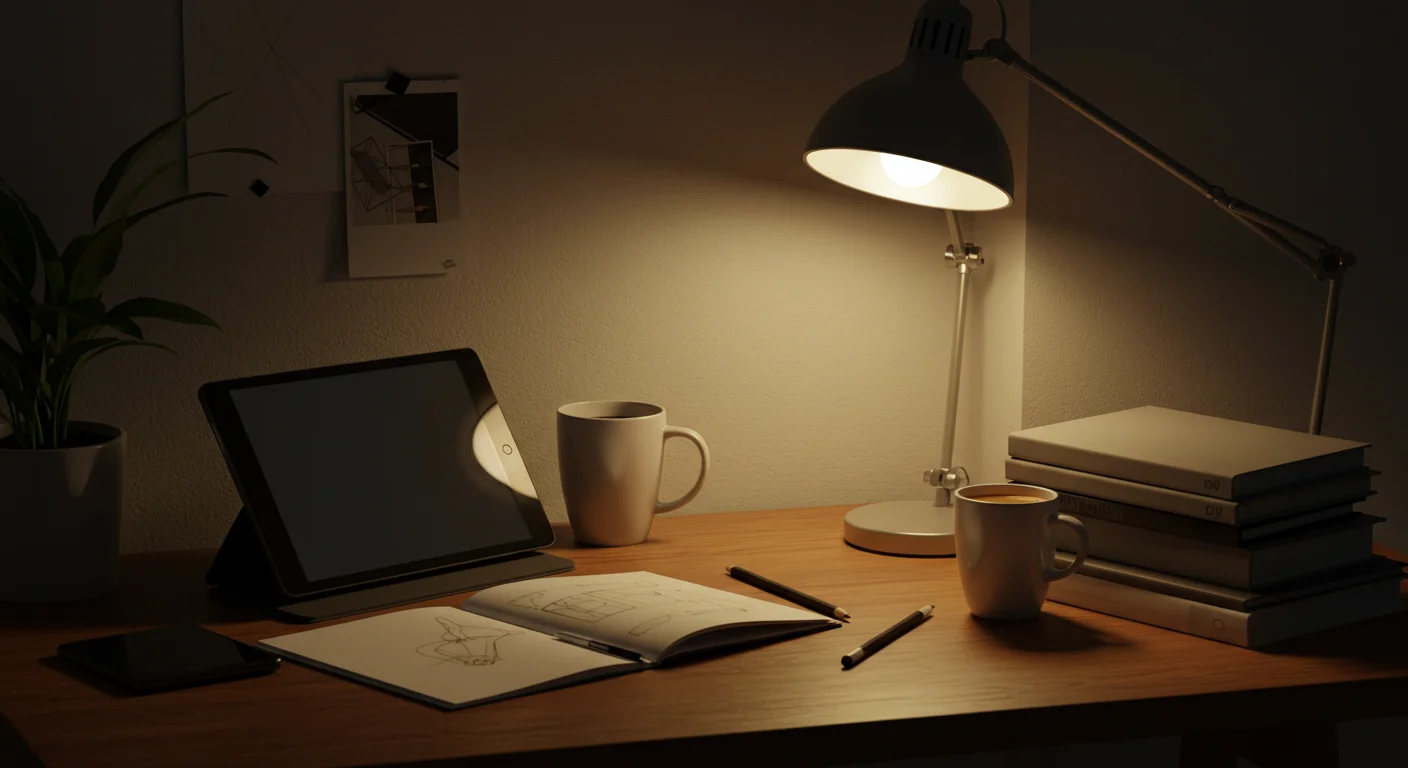 a workspace with design books, tablet, sketchbook, coffee cup, minimal aesthetic, warm lighting, cozy creative studio