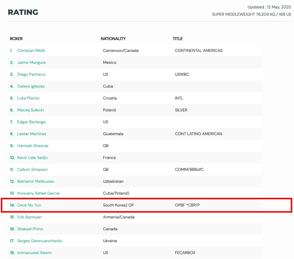 2025년 WBC 세계랭킹 14위! 한국 복서 윤덕노, 슈퍼미들급 랭크의 의미는? / 랭킹 진입 기준 / 윤덕노 WBC 랭킹