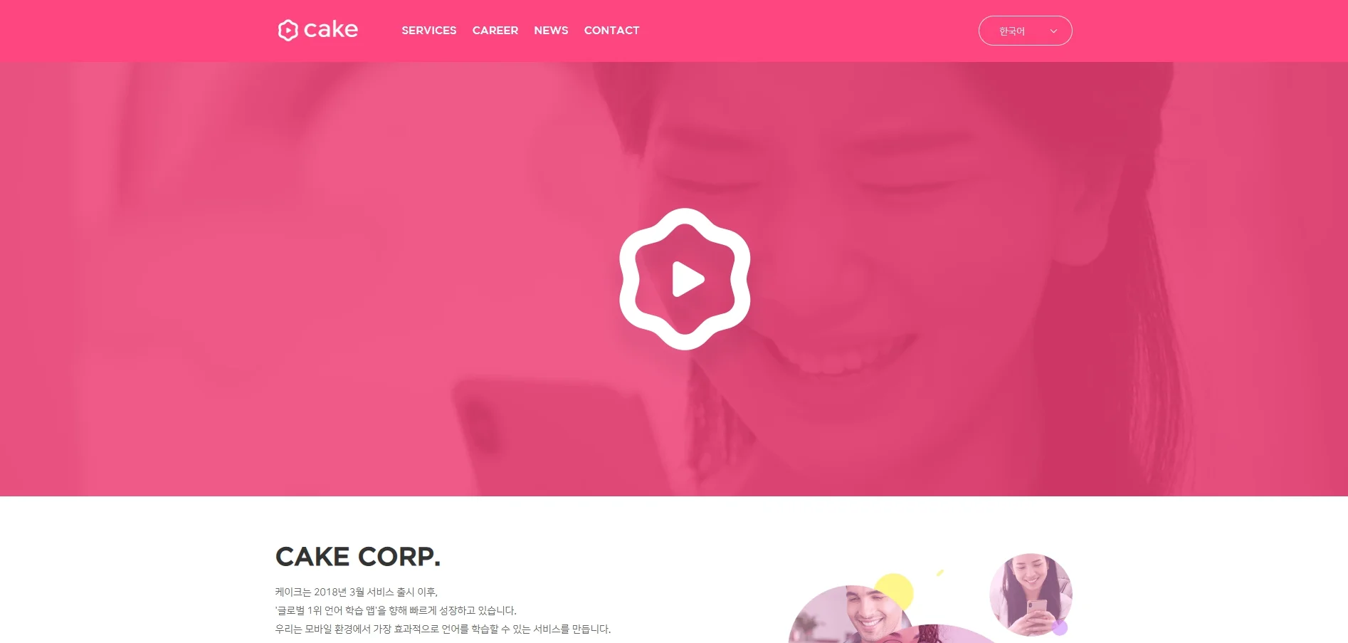 CAKE CORP. 케이크는 2018년 3월 서비스 출시 이후, '글로벌 1위 언어 학습 앱'을 향해 빠르게 성장하고 있습니다. 우리는 모바일 환경에서 가장 효과적으로 언어를 학습할 수 있는 서비스를 만듭니다