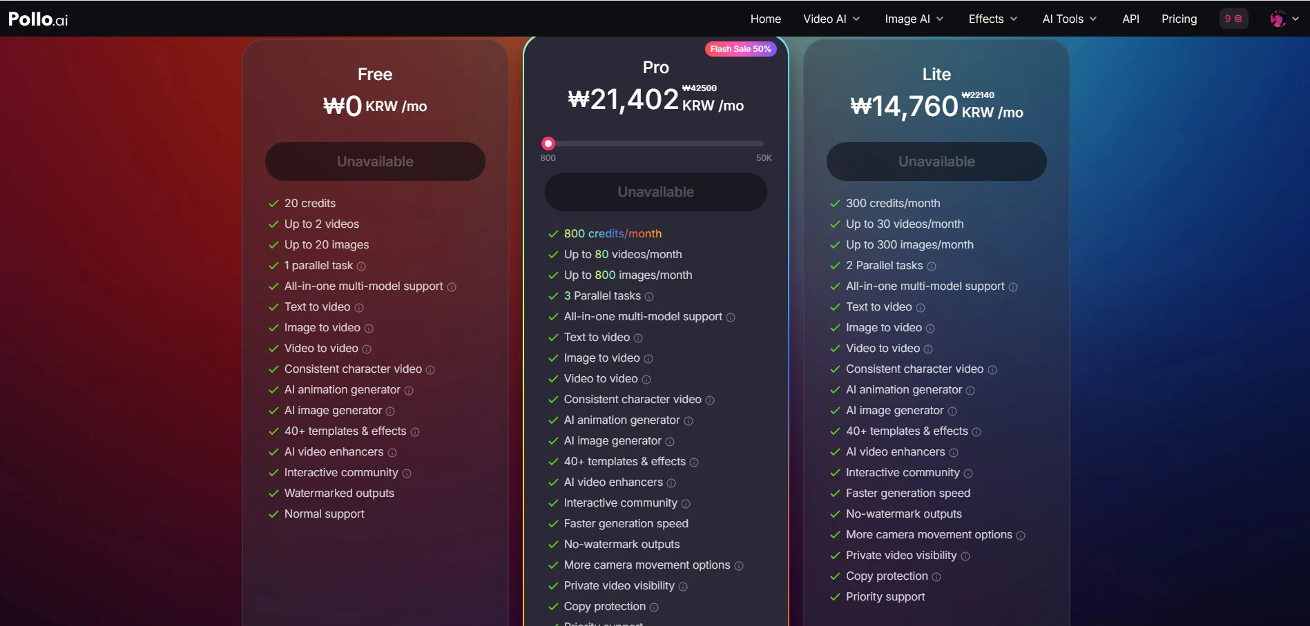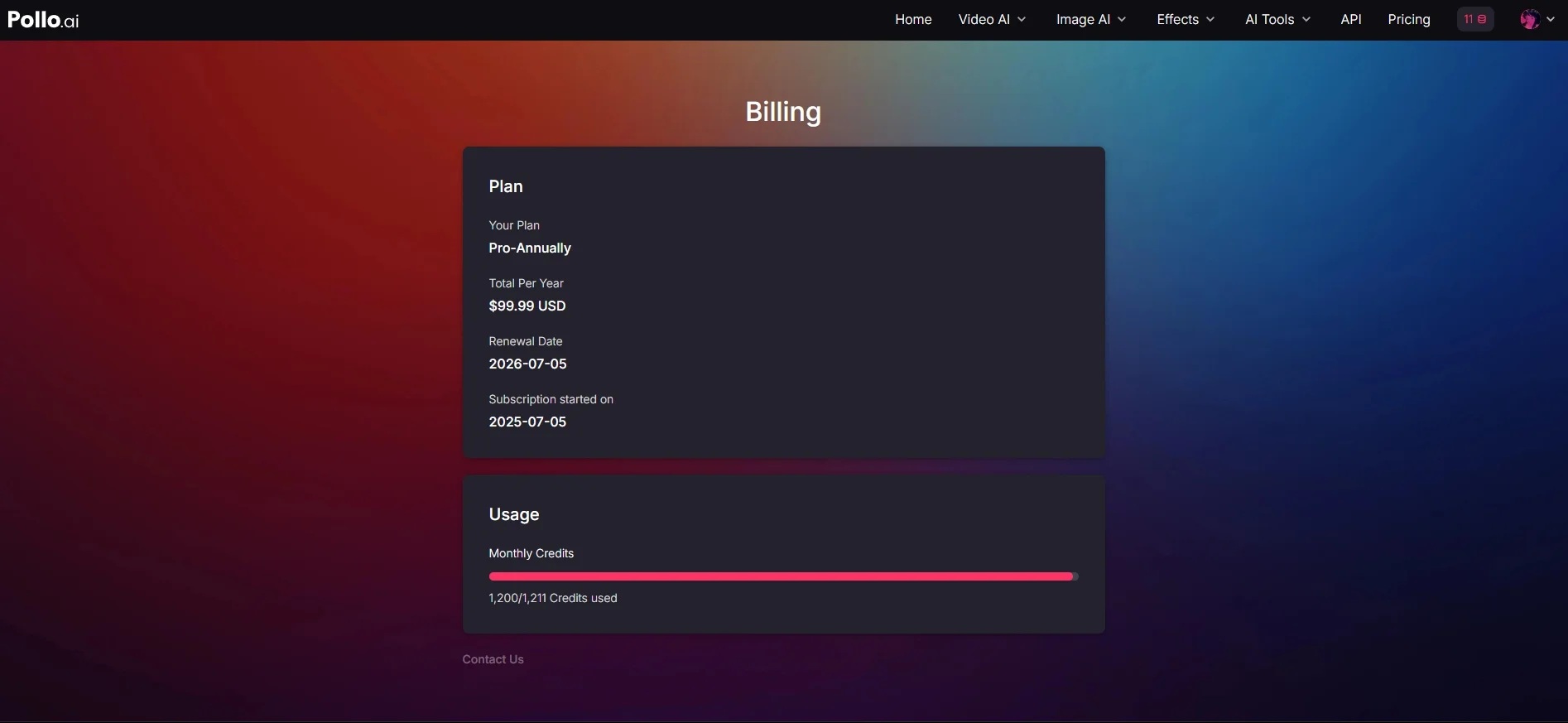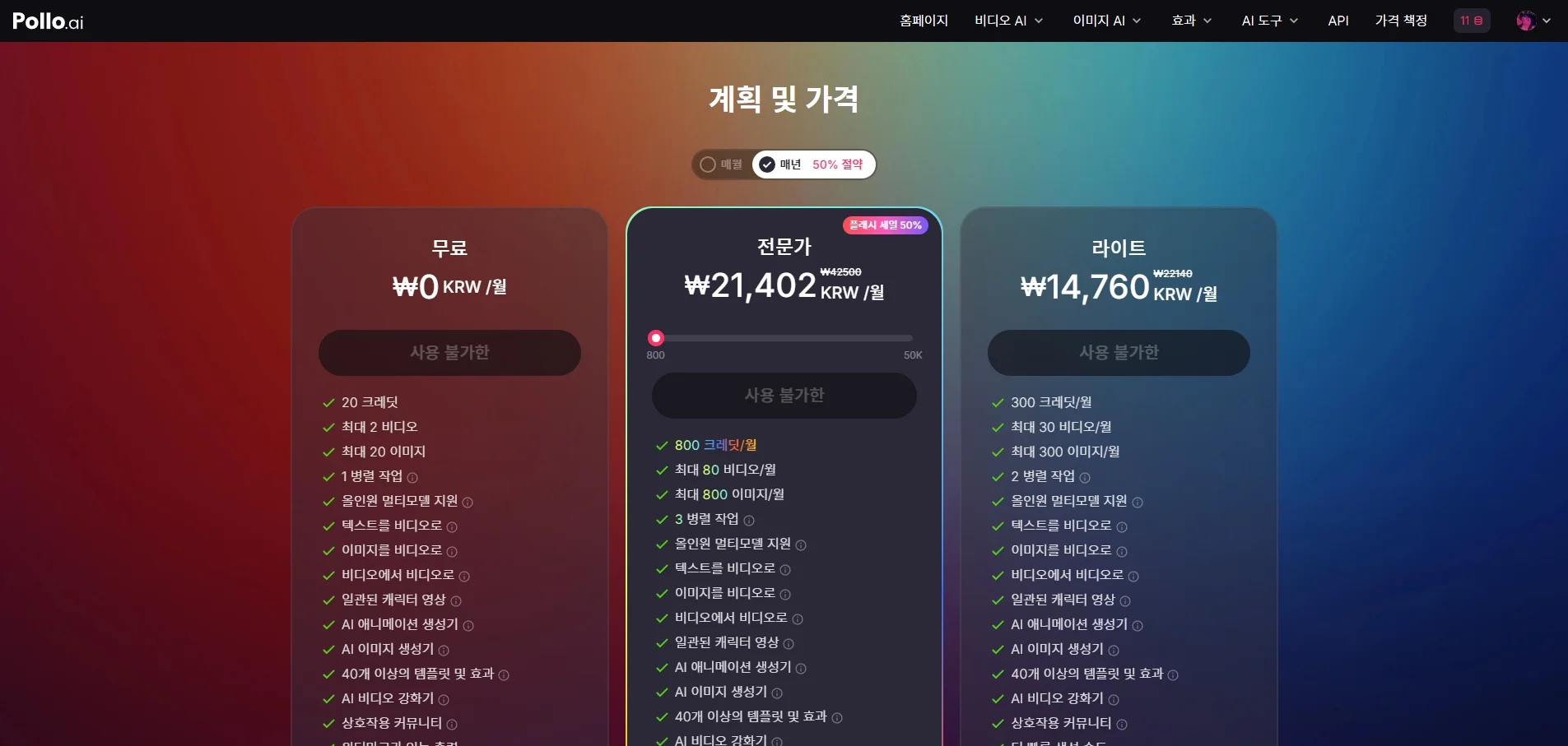 가격 부담 때문에 비교 끝에 Pollo.ai 프리미엄을 연간 결제하게 되었어요.