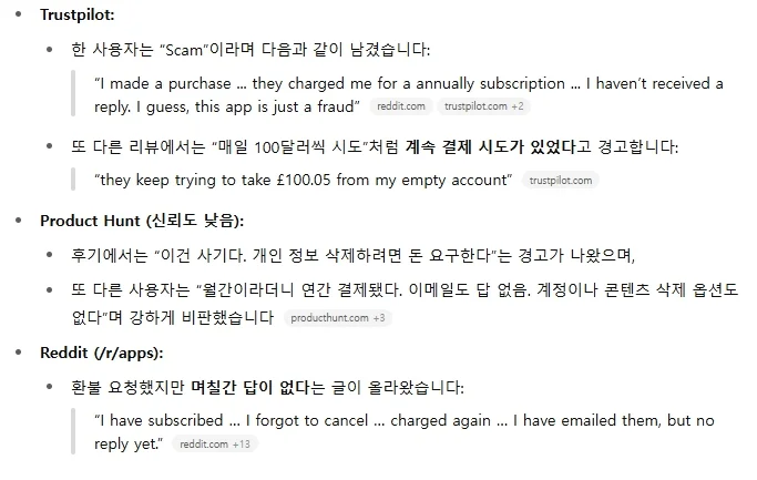 ⚠ 환불/자동결제 관련 후기 (Reddit 발췌)